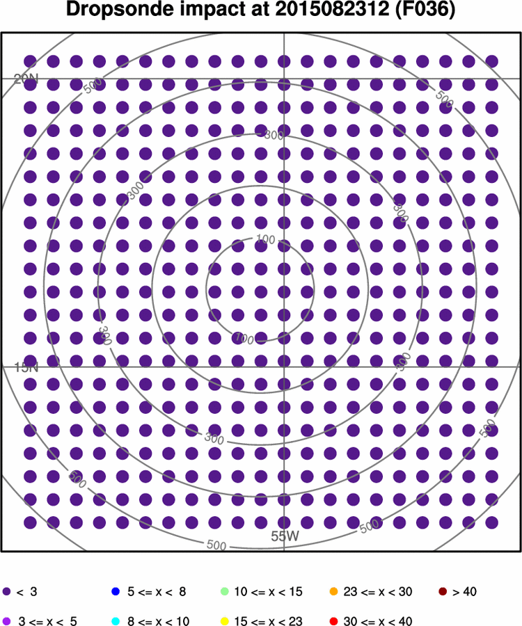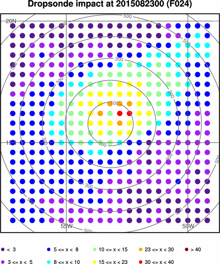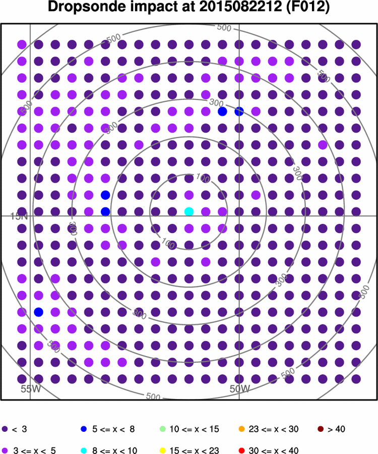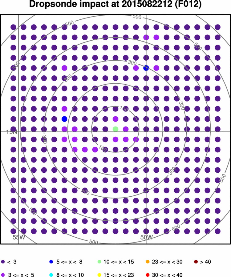 - Dropsonde impact is the hypothetical reduction in the forecast metric ensemble standard deviation by assimilating all mandatory level data from a dropsonde at that location.