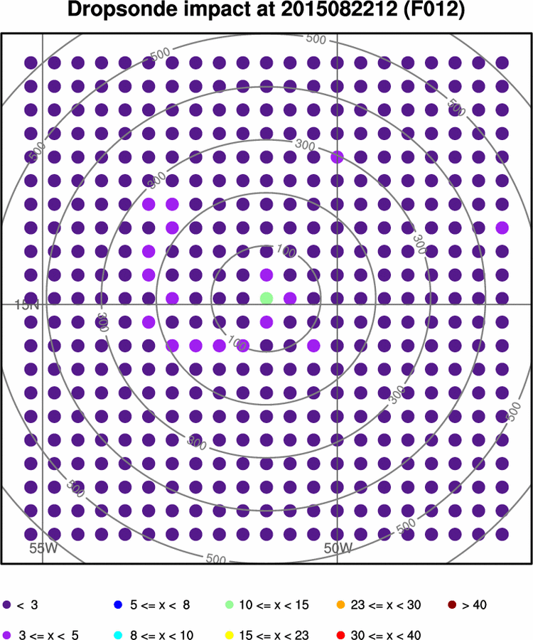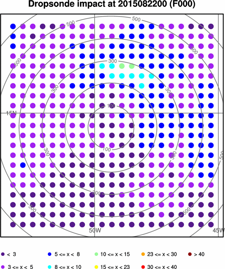 Hypothetical percentage reduction in forecast metric standard deviation due to assimilating all variables from dropsonde at that location.Dropsonde Impact 000 012 024 036 048 060 072 Loop Wind Dropsonde Observation Impact