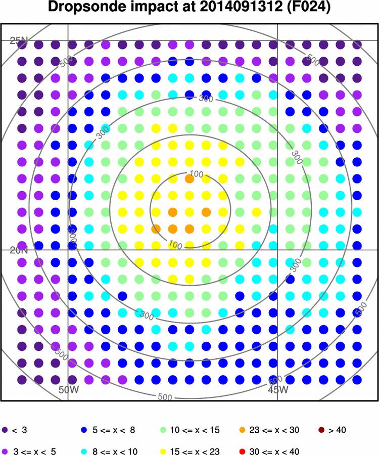 Hypothetical percentage reduction in forecast metric standard deviation due to assimilating all variables from dropsonde at that location.Dropsonde Impact 000 012 024 036 048 060 072 Loop Wind Dropsonde Observation Impact